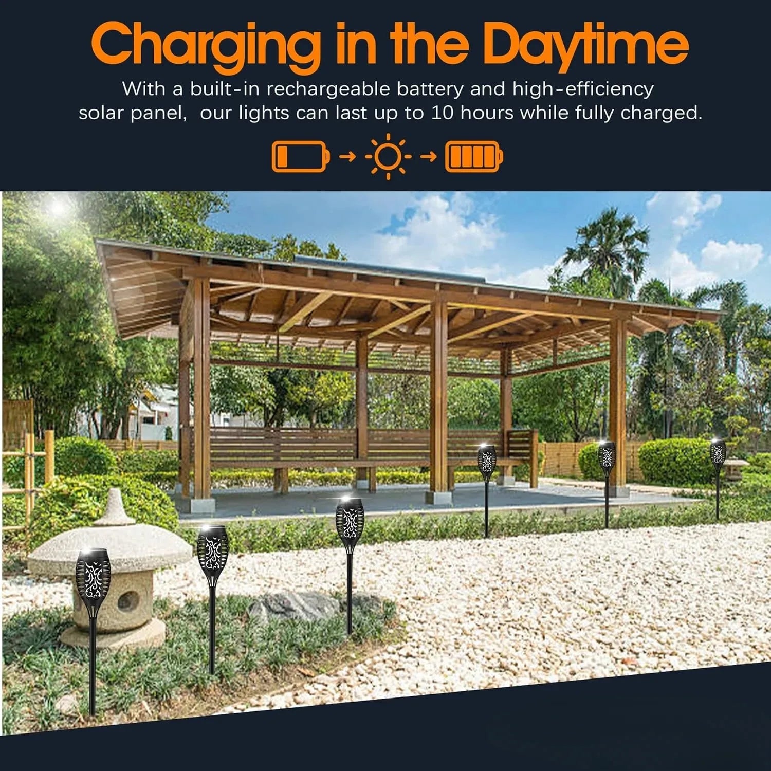 - WIDELY USE & EASY SET UP - Flickering flame solar torch is a prefect choice for Home, Garden, Yard, Pathway, Walkway's Landscape Decorations and garden party, camping, barbecue, wedding, Christmas, Halloween festival, which could provide a perfect campfire ambience. No wiring required, simply install the torch solar lights anywhere you like and enjoy the real and safe "Flame